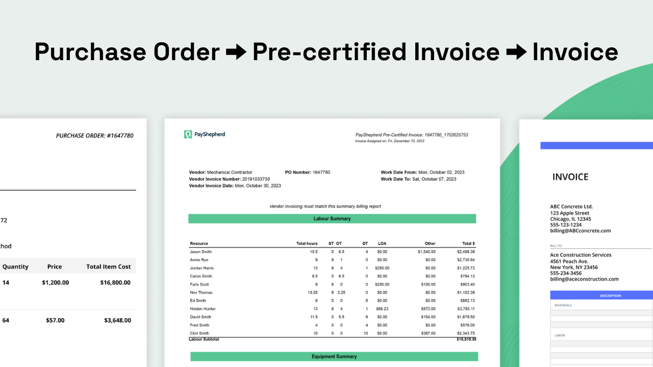 Automatically verify each invoice line item against contract terms and the approved PO. Contractors generate a pre-certified invoice at submission, giving Finance the proof needed for faster review and approval. This reduces payment delays, minimizes disputes, and keeps cash flow moving without extra reconciliation work.